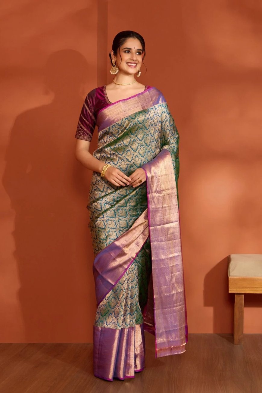 Hailing from the temple town of Kanchipuram in Tamil Nadu, the Kanjeevaram is a marvel of structural integrity and vivid colour. What sets this saree apart is the three-shuttle weaving technique, where the border, the body, and the pallu are often woven separately and joined with a signature zigzag stitch. The motifs are deeply rooted in South Indian temple architecture, featuring silhouettes of peacocks, lions, and mangoes, all rendered in thick, high-quality silk. Kanjeevaram is famous for its durability and "wrinkle-free" drape.