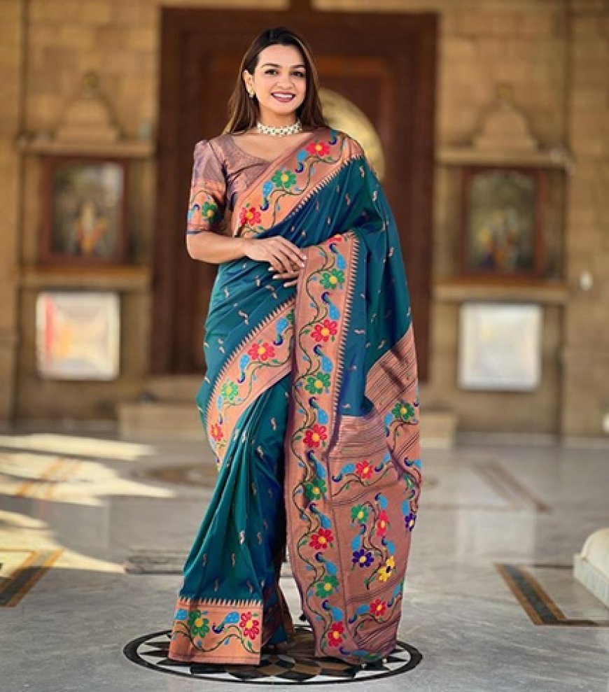 The Paithani saree from Maharashtra is luxurious because of its delicate, artistic nature. Its most striking feature is the tapestry-style pallu, which is woven using a technique where the threads of different colours are interlocked to create patterns that look identical on both sides. Unlike the heavy zari work of Banarasi, the Paithani focuses on nature-inspired motifs like the muniya (parrot) and the lotus. The base silk is usually very fine and glossy, providing a smooth canvas for that dance across the borders, making it a favourite for traditional Maharashtrian celebrations.