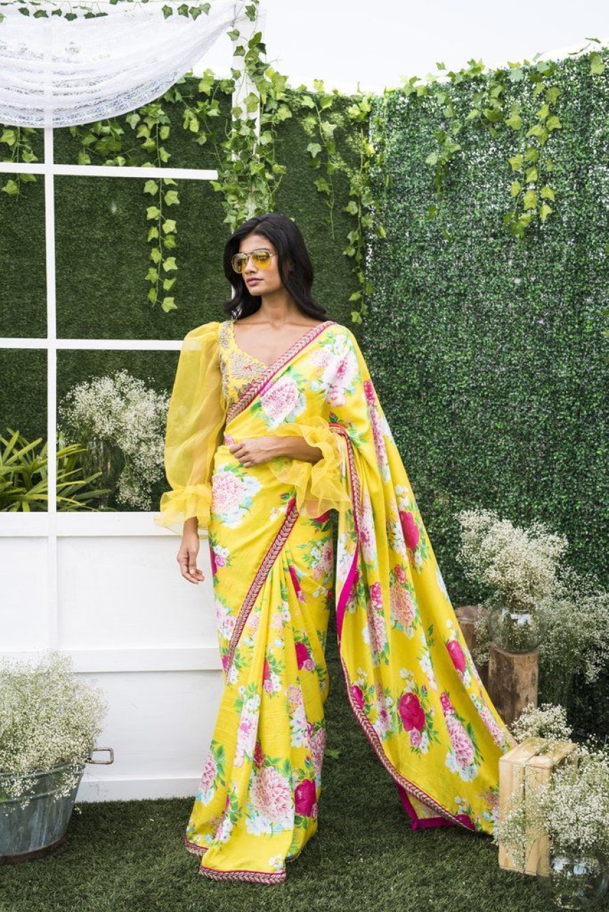 This vibrant yellow organza saree is a refreshing take on contemporary ethnic wear, featuring a lush floral print of pink and white peonies. The garment is elevated by a distinct magenta and gold embroidered border, which provides a striking color contrast and a touch of traditional craftsmanship. A standout feature is the experimental blouse, which boasts voluminous, sheer bishop sleeves with ruffled cuffs, blending Victorian aesthetics with Indian drape.