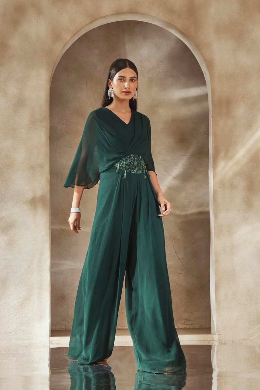 The Vibe: Look unique. If you prioritise comfort above all, the fusion jumpsuit is your best friend. Look for silhouettes with wide-legged bottoms and an embroidered bodice. The cinched waist belt (often with the brand logo or Zardozi work) adds structure to the flowy fabric.