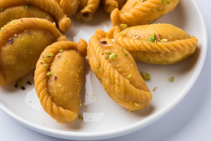 These are the crown jewels of any Holi celebration. They are crescent-shaped pastries made from a refined flour dough. The magic lies in the filling, known as mawa or khoya, which is roasted until aromatic and then mixed with desiccated coconut, green cardamom powder, and finely chopped nuts like almonds and pistachios. Once stuffed and crimped either by hand or with a mould, they are deep-fried in pure ghee until they achieve a crisp, golden-brown shell that shatters delightfully upon the first bite.