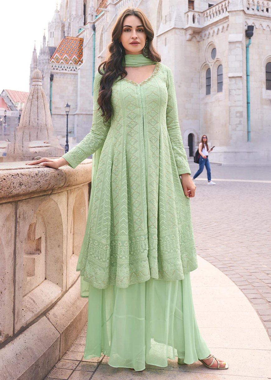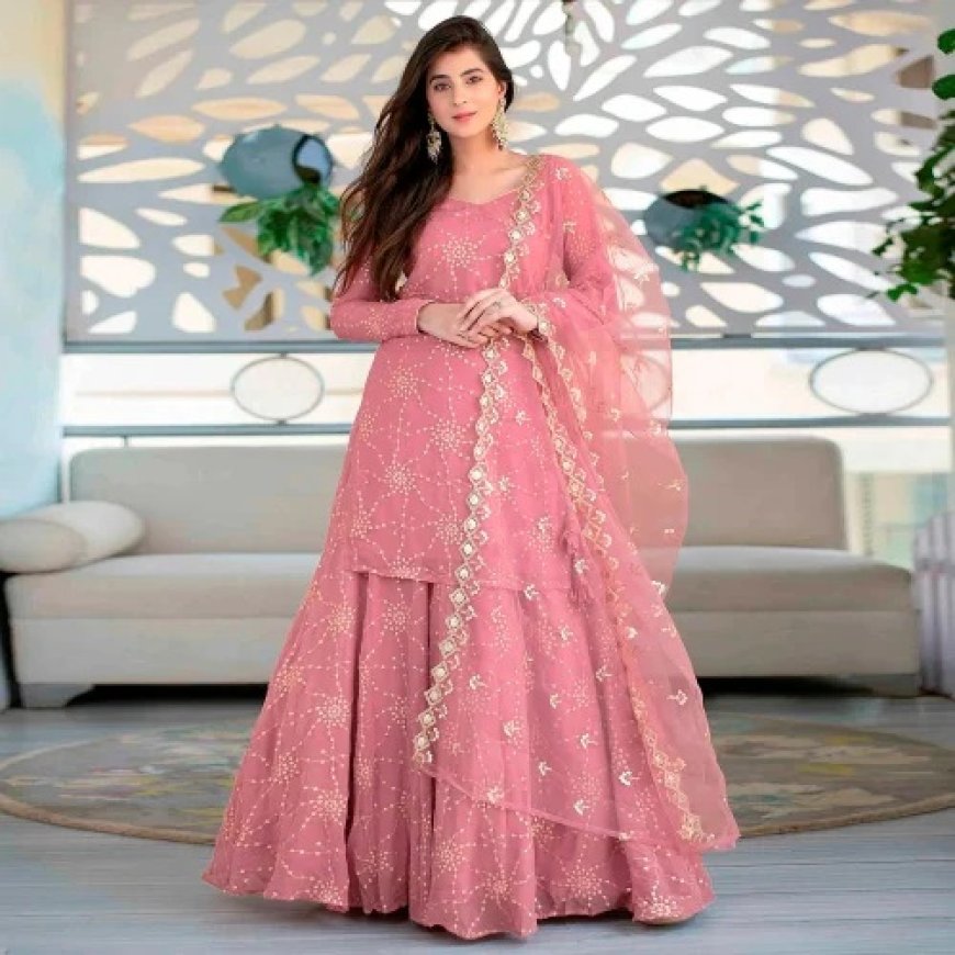 The Details: This look is all about the "twirl factor." When you spin, the layers of the Anarkali and the Sharara create a mesmerising, fountain-like effect. It is often adorned with Zardosi work or Mirror work to catch the stage lights.