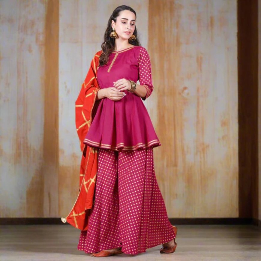The Peplum Sharara is a masterclass in proportion. The top is a short, structured tunic that cinches tightly at the waist and flares out over the hips, creating a dramatic "flared-on-flared" effect when paired with wide-legged bottoms.